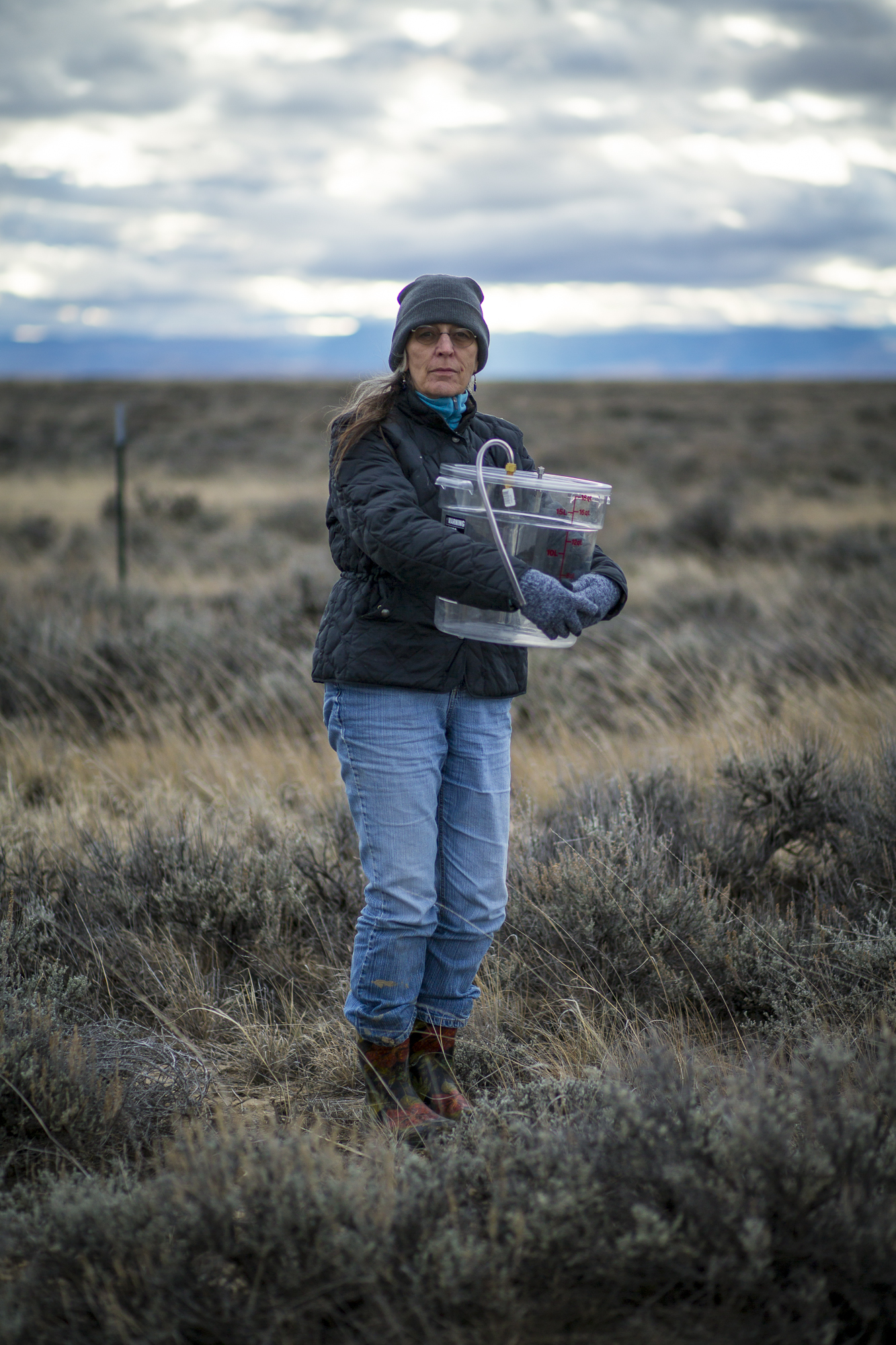 Deb Thomas with her air sampling bucket in Wyoming.
