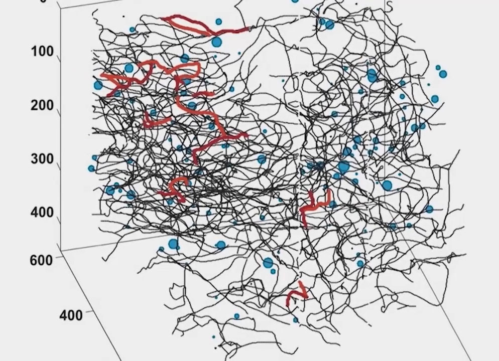 Computer generated image of blood vessels in the brain, with red lines marking stalled vessels.