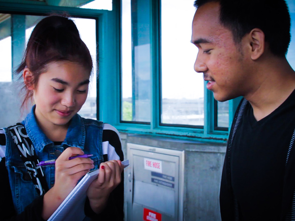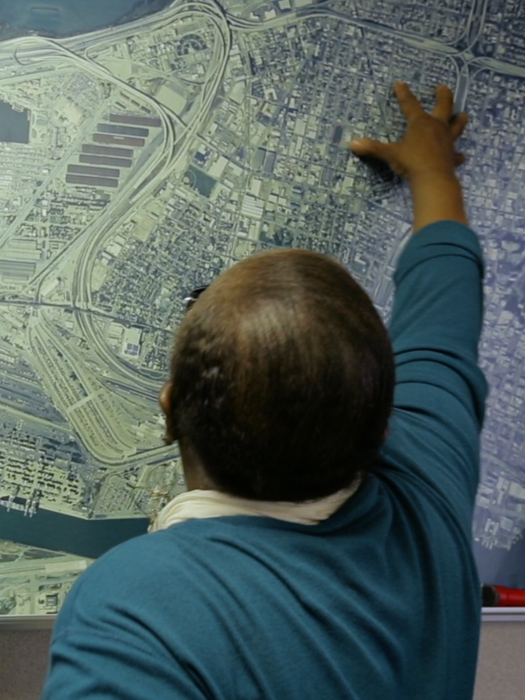Margaret showing how her neighborhood, West Oakland, is surrounded by industry.