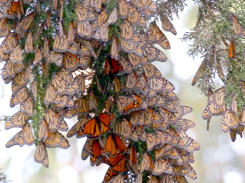 Most of the time, when they're densely packed, you count up to maybe ten in a group that's in a cluster of as many as a hundred or even more. Then, you count how many of those tens are in that particular cluster. You usually count in pairs. When you're going through this estimating process, you write down the average of the two counts. Sometimes that gets very confusing and complicated when you have trees with thousands of butterflies. We've had trees that have had as many as five thousand butterflies!